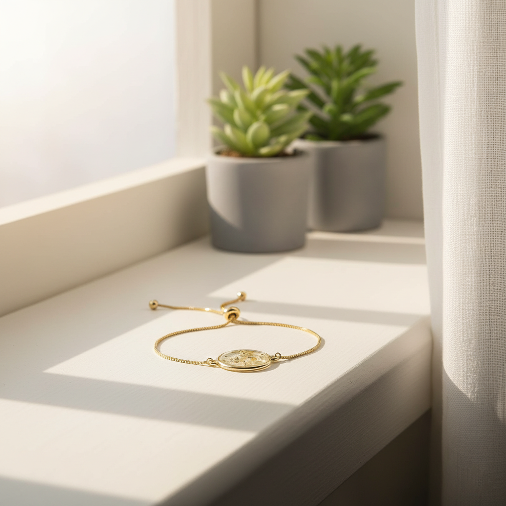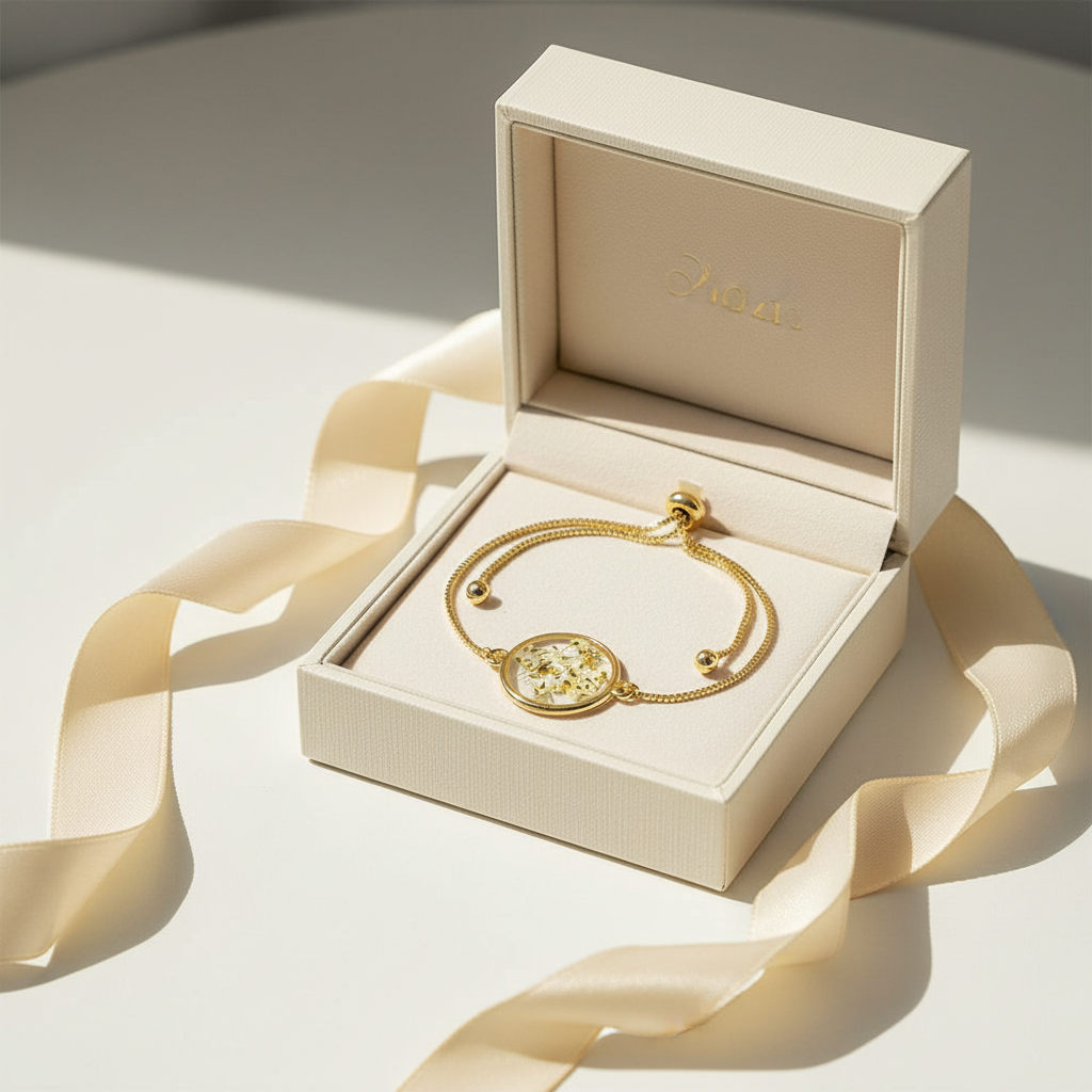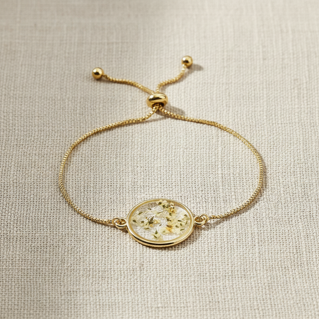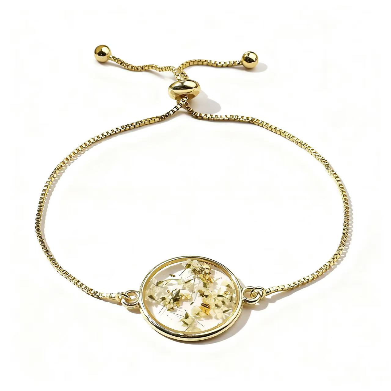 This exquisite gold bracelet showcases a round transparent glass charm delicately filled with preserved white dried flowers. Its adjustable sliding chain ensures a comfortable and secure fit for any wrist size. Designed with a minimalist yet timeless style, this bracelet makes the perfect accessory for everyday elegance, weddings, anniversaries, or as a meaningful gift. Handcrafted with attention to detail, it brings together natural beauty and refined craftsmanship.