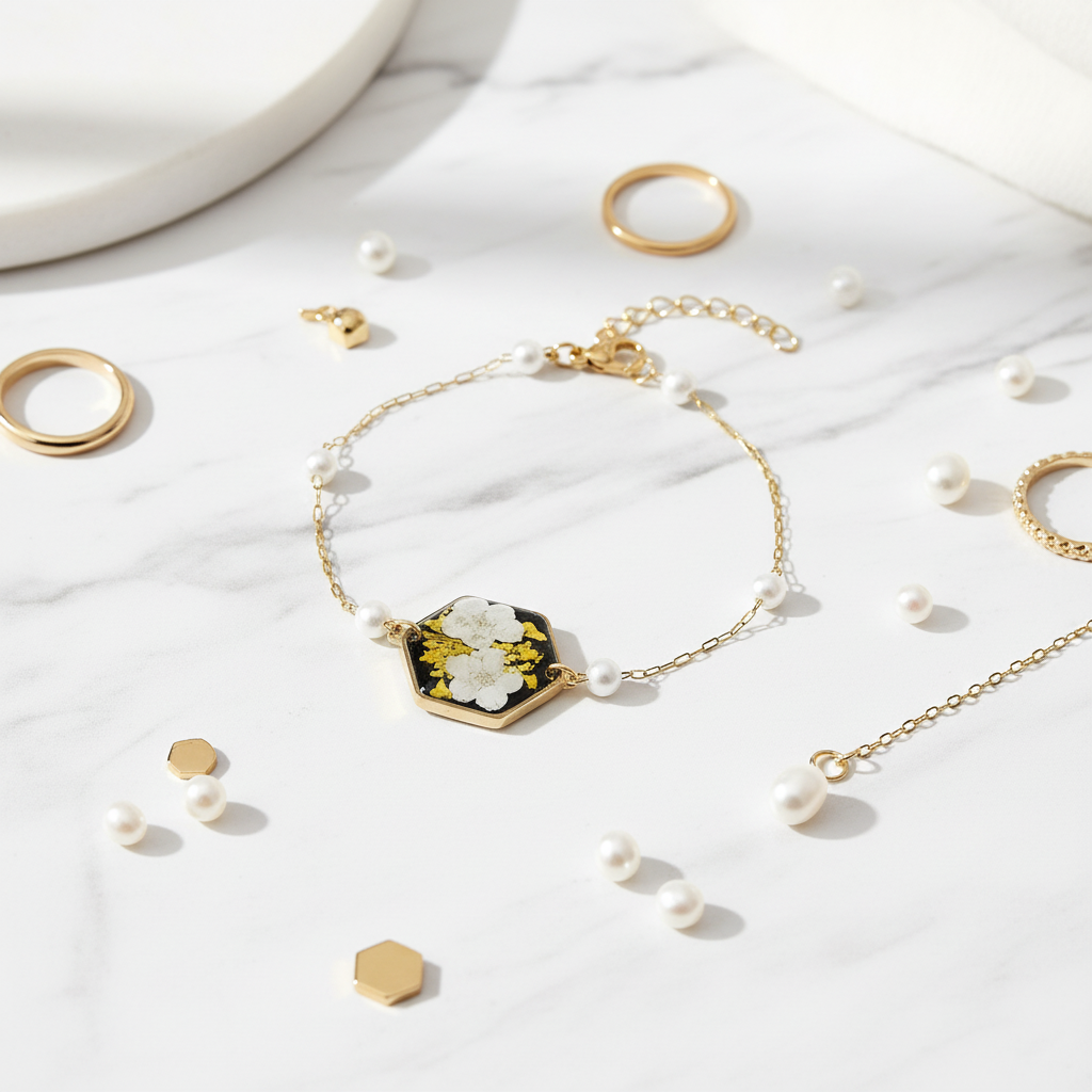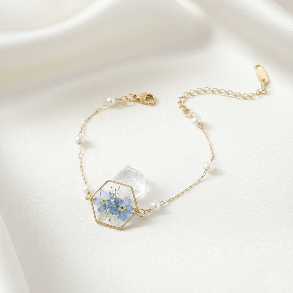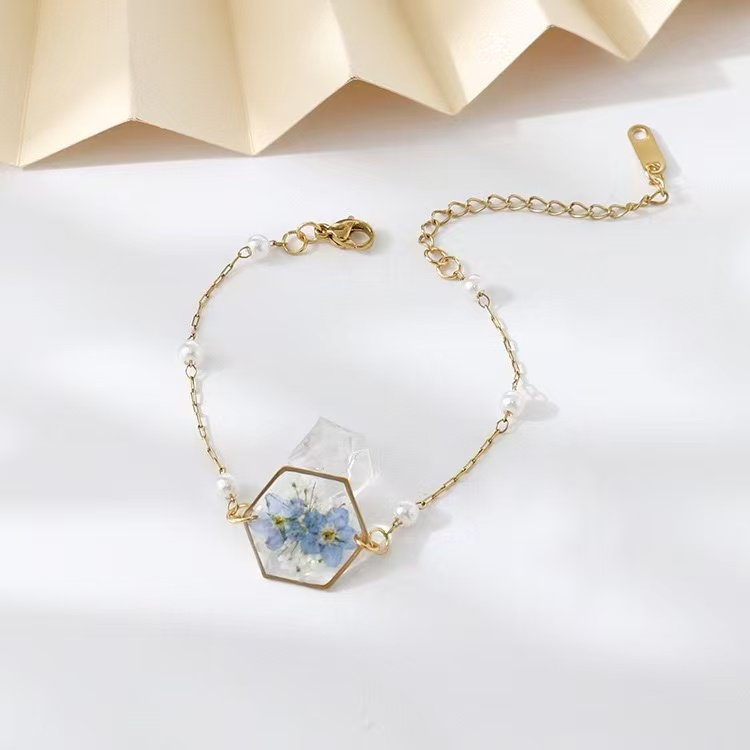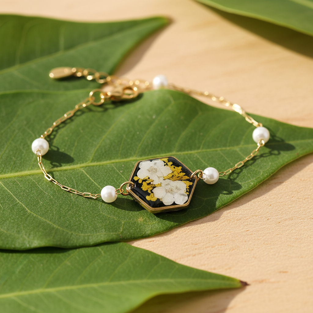 Delicately handcrafted, these hexagon resin bracelets capture the timeless beauty of real pressed flowers. Each piece encases natural botanical elements in crystal-clear resin, framed with a golden hexagon edge. The bracelet chain is adorned with small imitation pearls for a touch of elegance, making it perfect for daily wear or as a thoughtful gift. Due to the handmade nature, each bracelet is one-of-a-kind, preserving the natural charm of flowers in every piece.