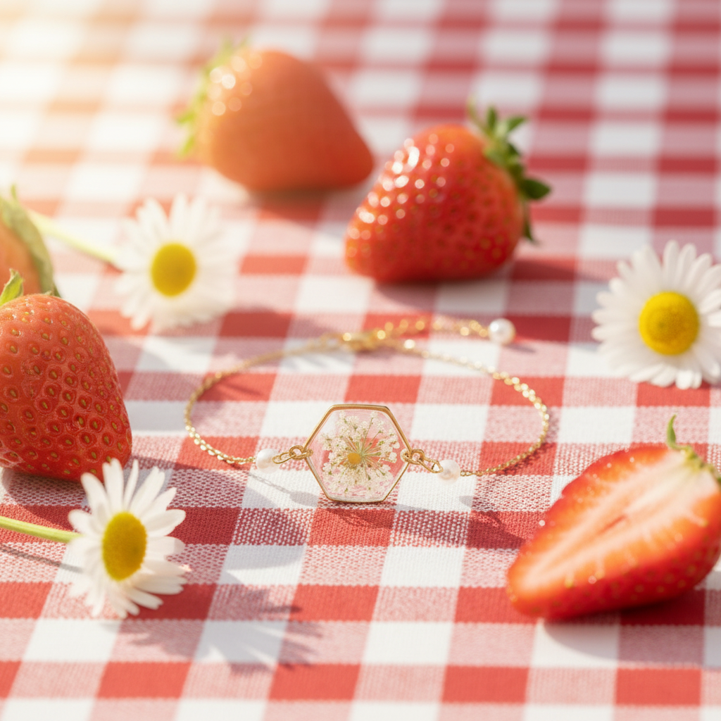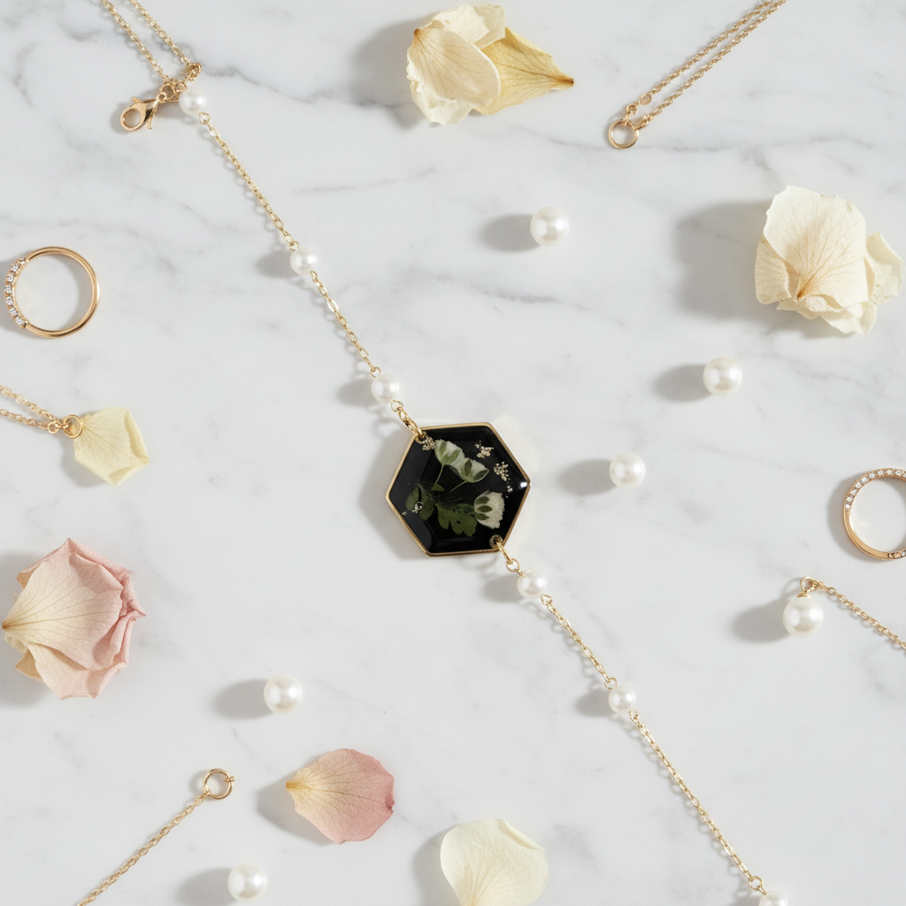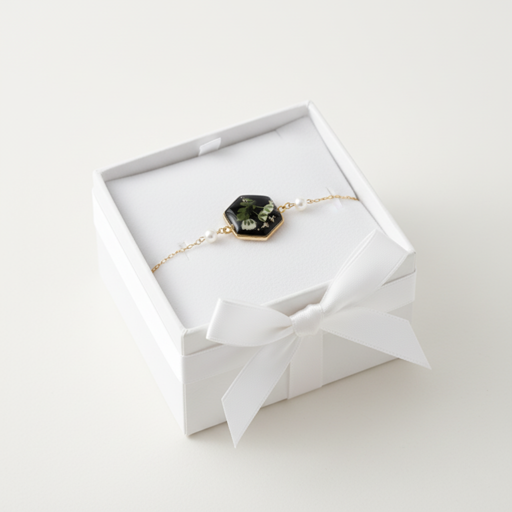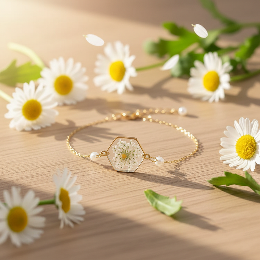 Delicately handcrafted, these hexagon resin bracelets capture the timeless beauty of real pressed flowers. Each piece encases natural botanical elements in crystal-clear resin, framed with a golden hexagon edge. The bracelet chain is adorned with small imitation pearls for a touch of elegance, making it perfect for daily wear or as a thoughtful gift. Due to the handmade nature, each bracelet is one-of-a-kind, preserving the natural charm of flowers in every piece.