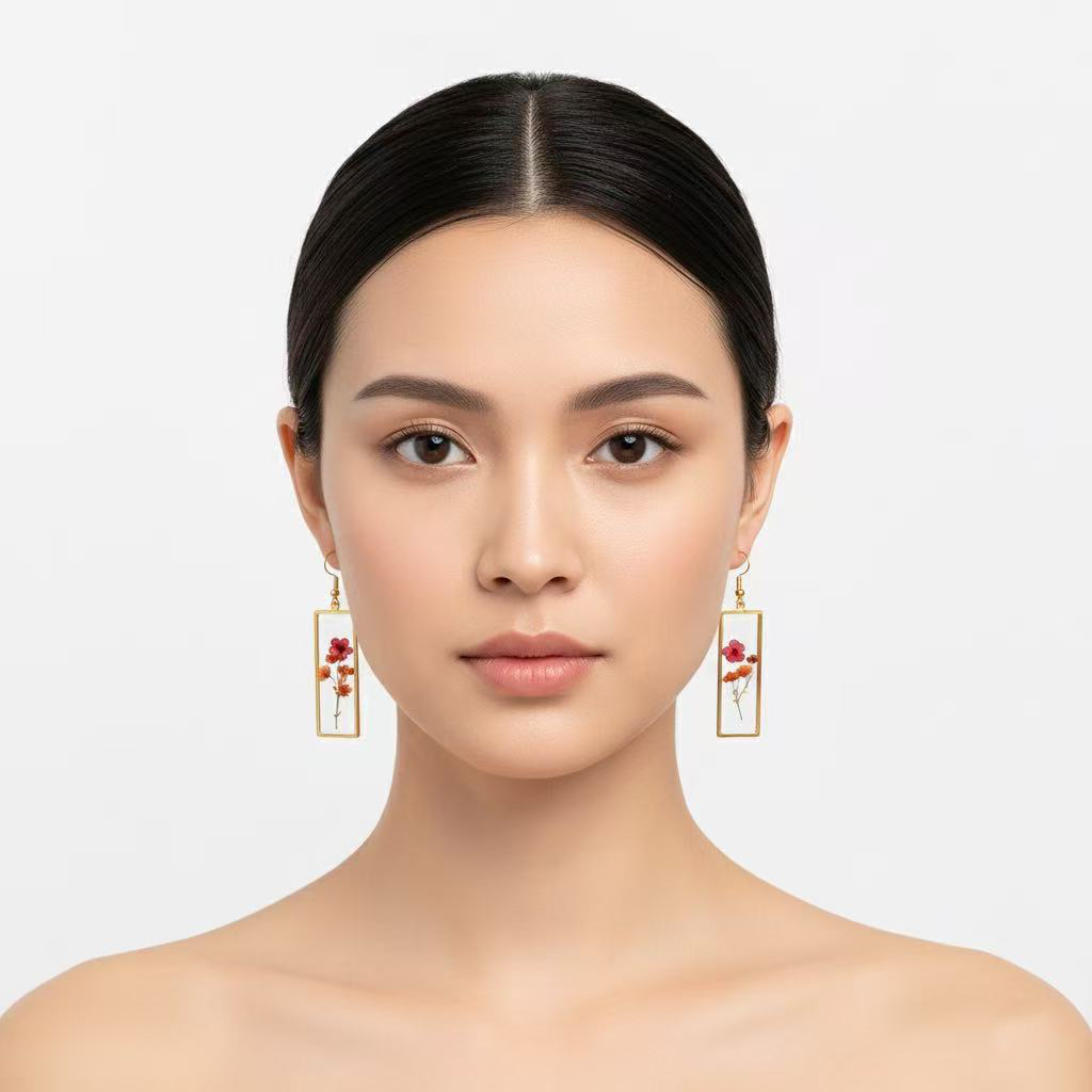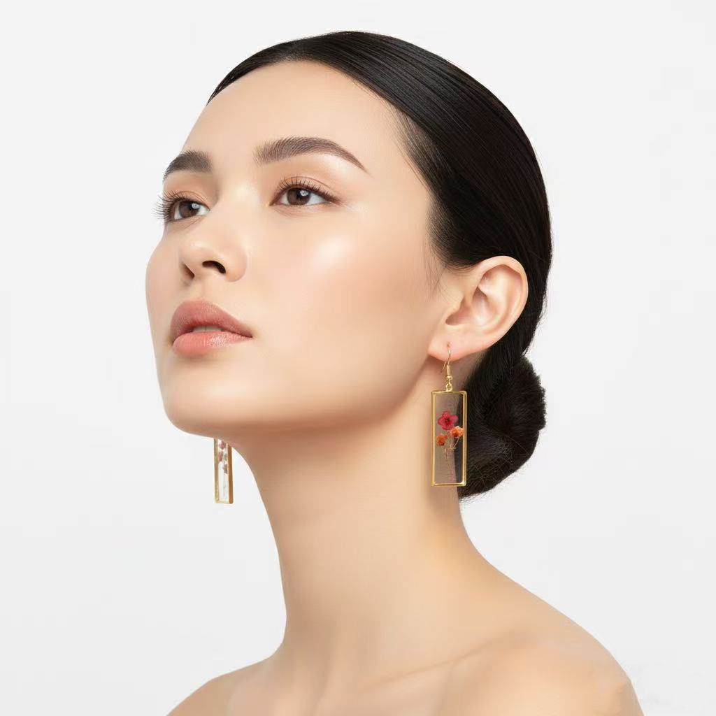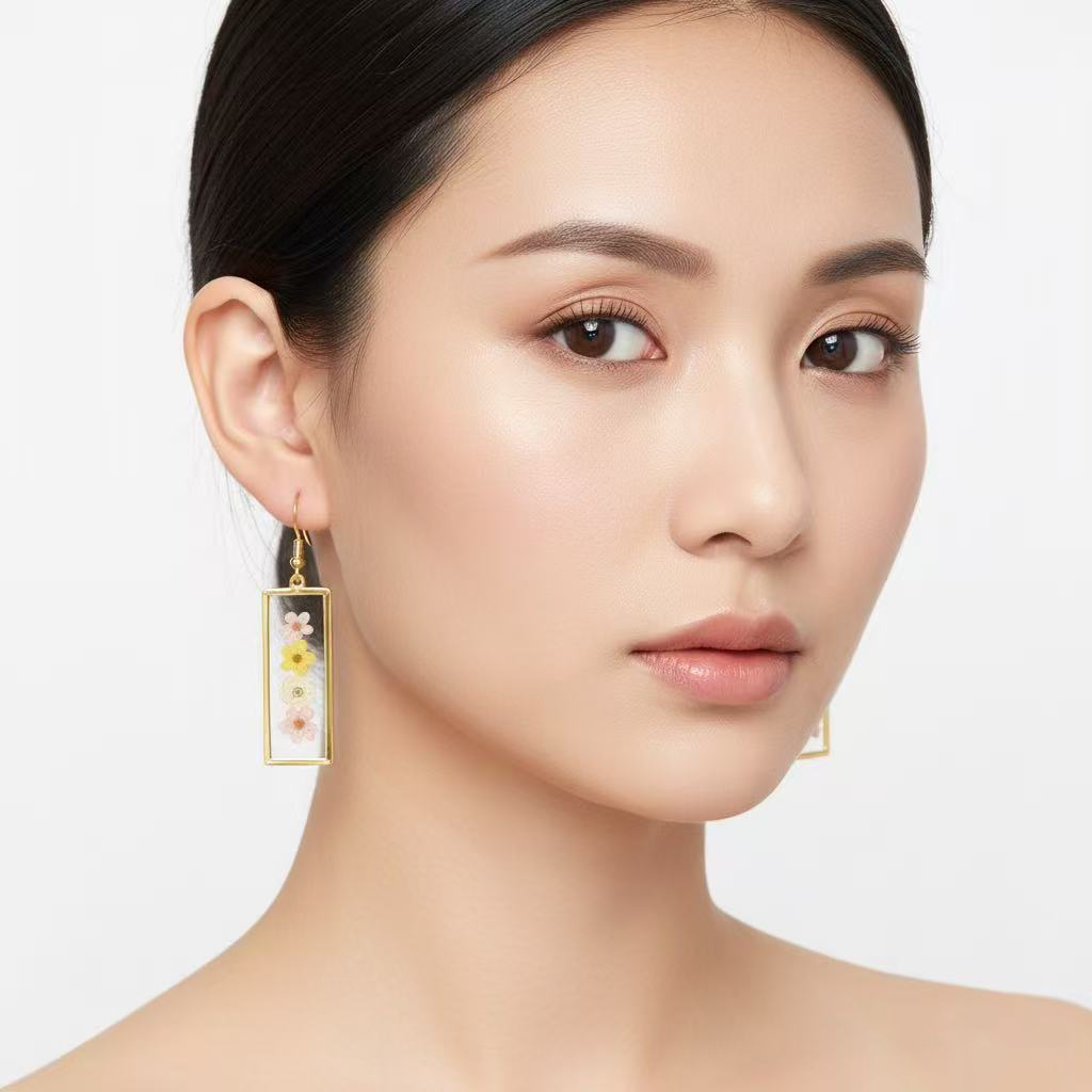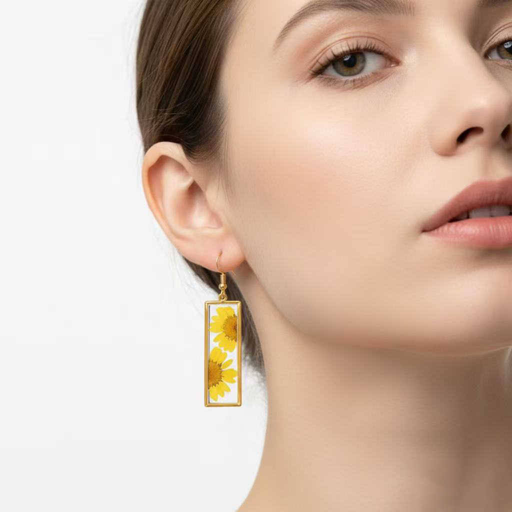 Bring nature’s beauty to your style with these elegant pressed flower resin earrings. Each pair features real dried flowers preserved in clear resin, framed with a delicate gold-tone rectangle. Perfect for adding a touch of natural charm and vibrant color to your everyday look or special occasions. Lightweight and comfortable to wear, these earrings make a thoughtful gift for nature lovers, friends, or yourself.