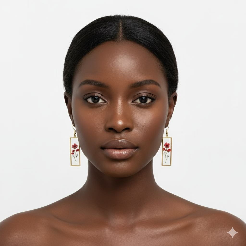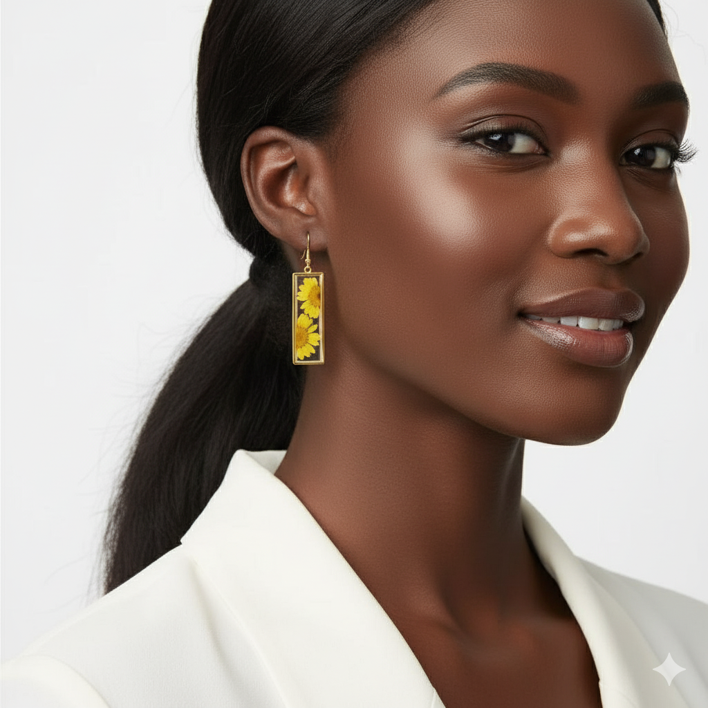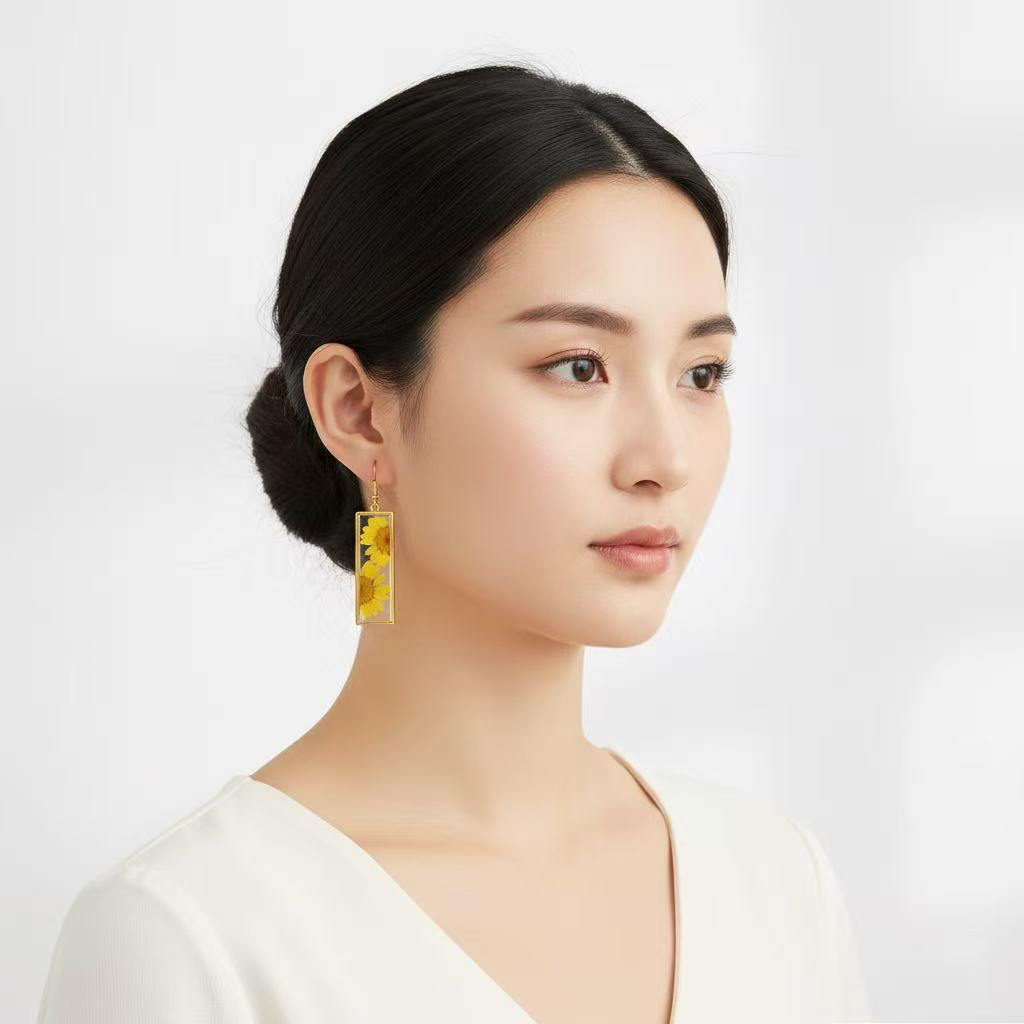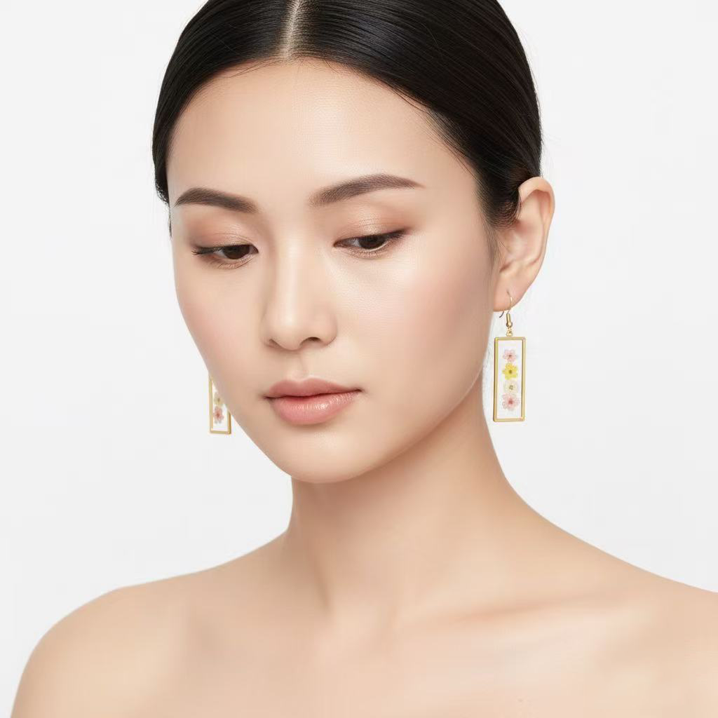 Bring nature’s beauty to your style with these elegant pressed flower resin earrings. Each pair features real dried flowers preserved in clear resin, framed with a delicate gold-tone rectangle. Perfect for adding a touch of natural charm and vibrant color to your everyday look or special occasions. Lightweight and comfortable to wear, these earrings make a thoughtful gift for nature lovers, friends, or yourself.